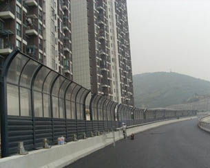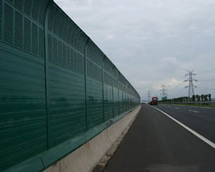 公路隔音墻安裝在公路兩旁的桁架上,由隔離箱、連結件和緊固件構成。隔音箱由π形箱體、百葉窗面板、填充吸音材料及上下兩端的封頭構成。高速公路上的噪音大部分由百葉窗進入,被吸音填充材料吸收,故高速公路自城區穿過也能達到噪音環保要求的指標。隔音墻的面板、箱體采取防銹措施,使其美觀、耐用。